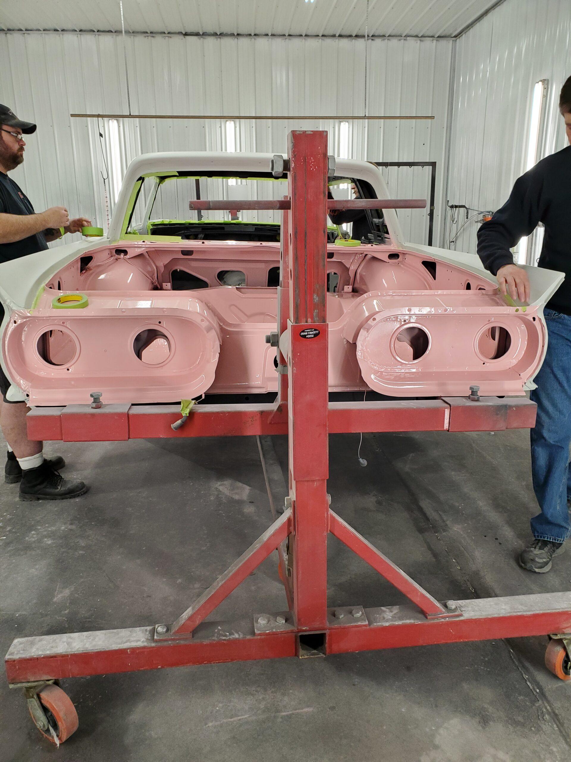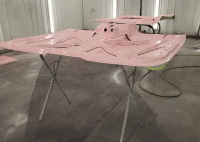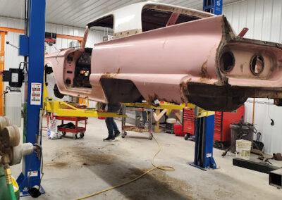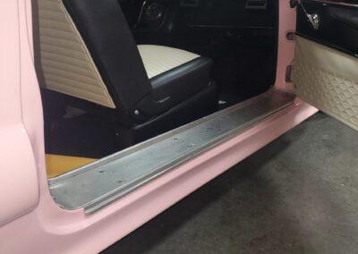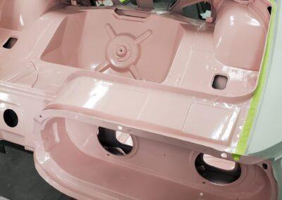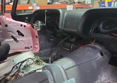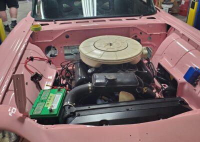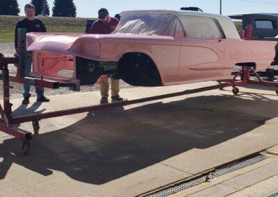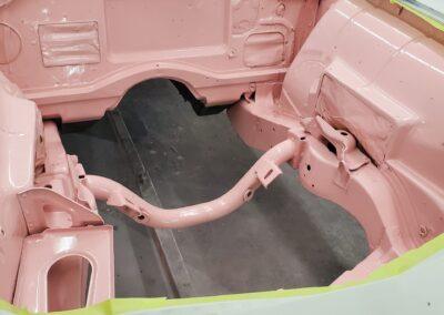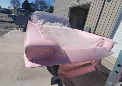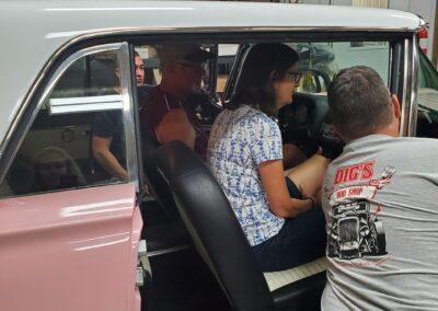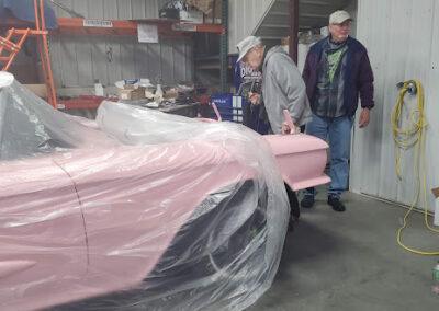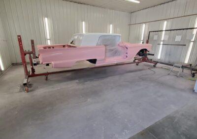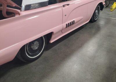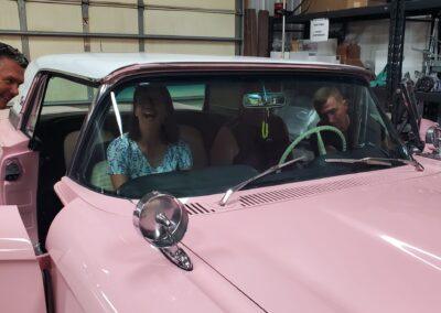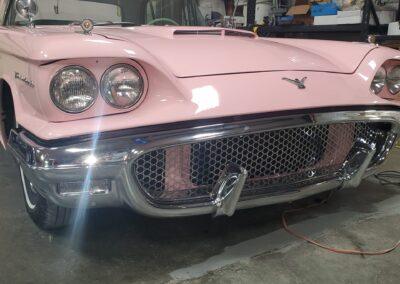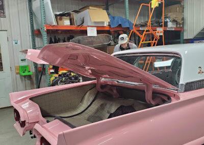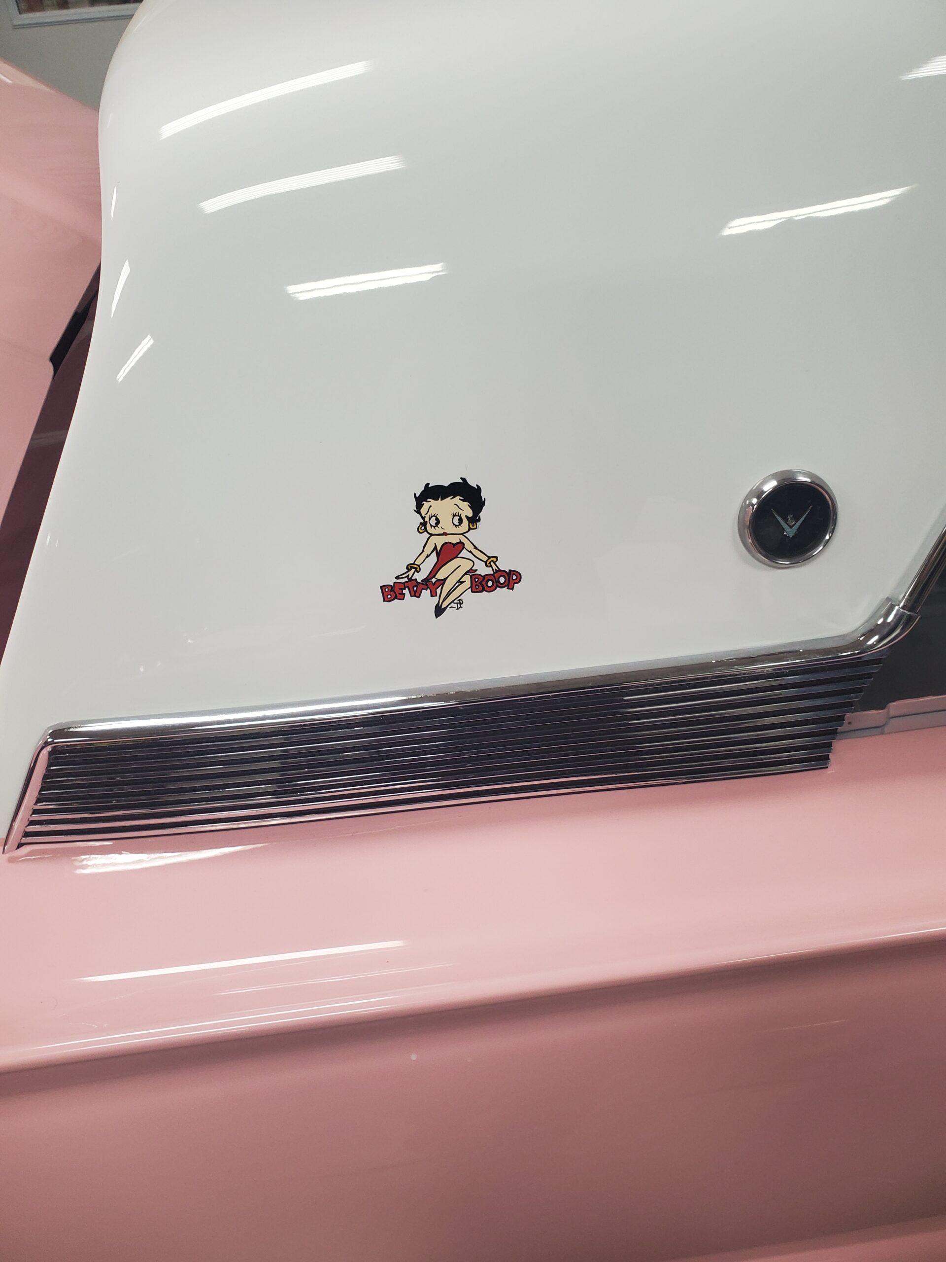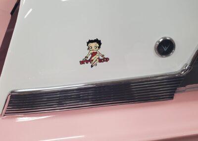 For the next 11 months, the car was completely disassembled, sorted, cataloged, mounted to the rotisserie, and then media blasted. That’s when the Fabrication Department took over. Because not all of the replacement sheet metal panels were available, many of the repair areas were handcrafted in-house here at Dig’s. After the metal work was complete it continued to the Body and Paint department where it received its original paint color combination: Cameo Rose and White, with a subtle, custom touch of White Pearl, with a hand-painted Betty Boop to give it that unique effect. Once all components were painted, it was moved to the Reassembly area, where all the pieces were inspected, cleaned, and polished. This car received a new reproduction interior kit, wiring harness, glass, weather stripping, aftermarket Vintage Air A/C system, full exhaust, new tires, rechromed bumpers, among many other upgrades.