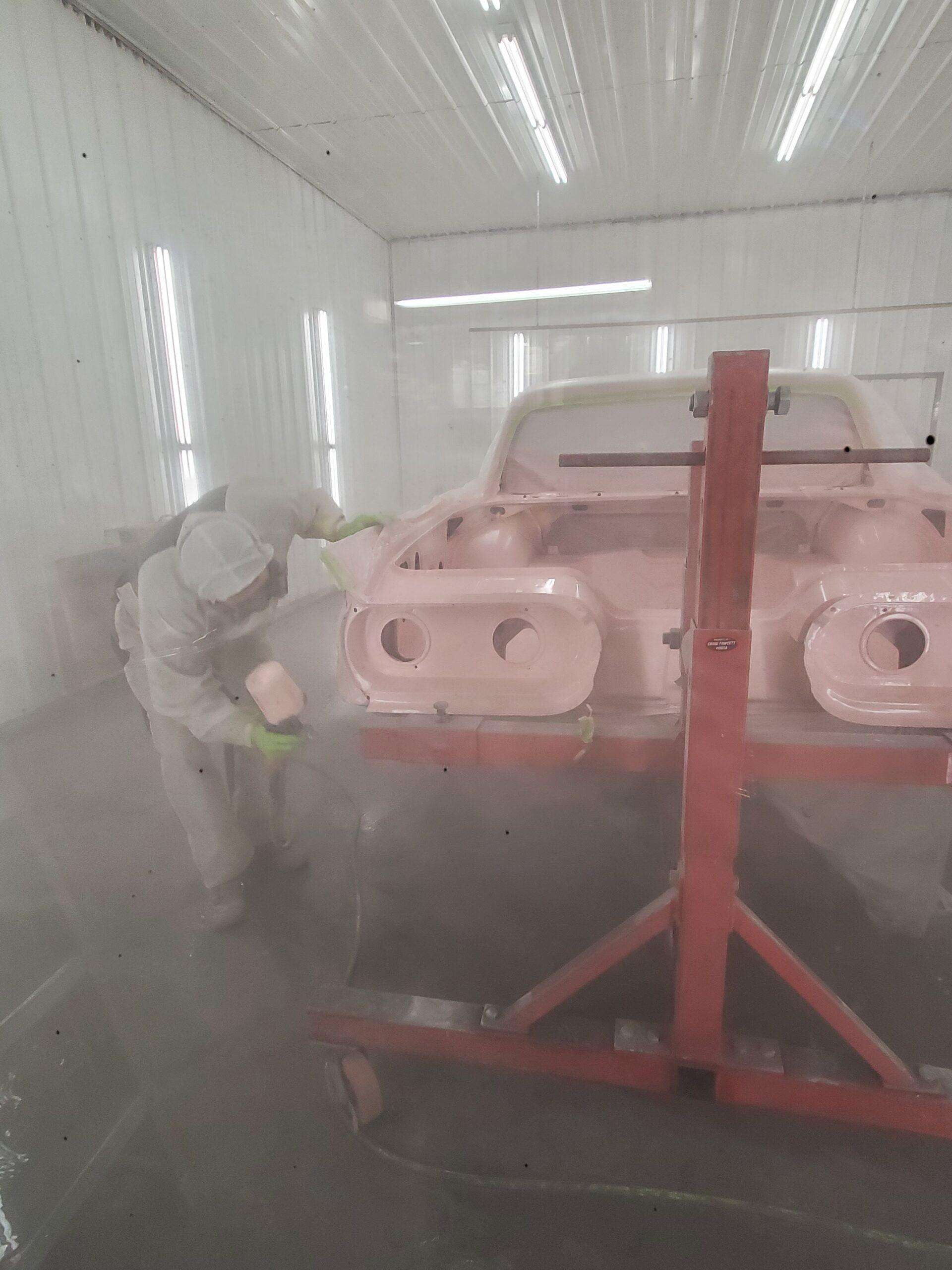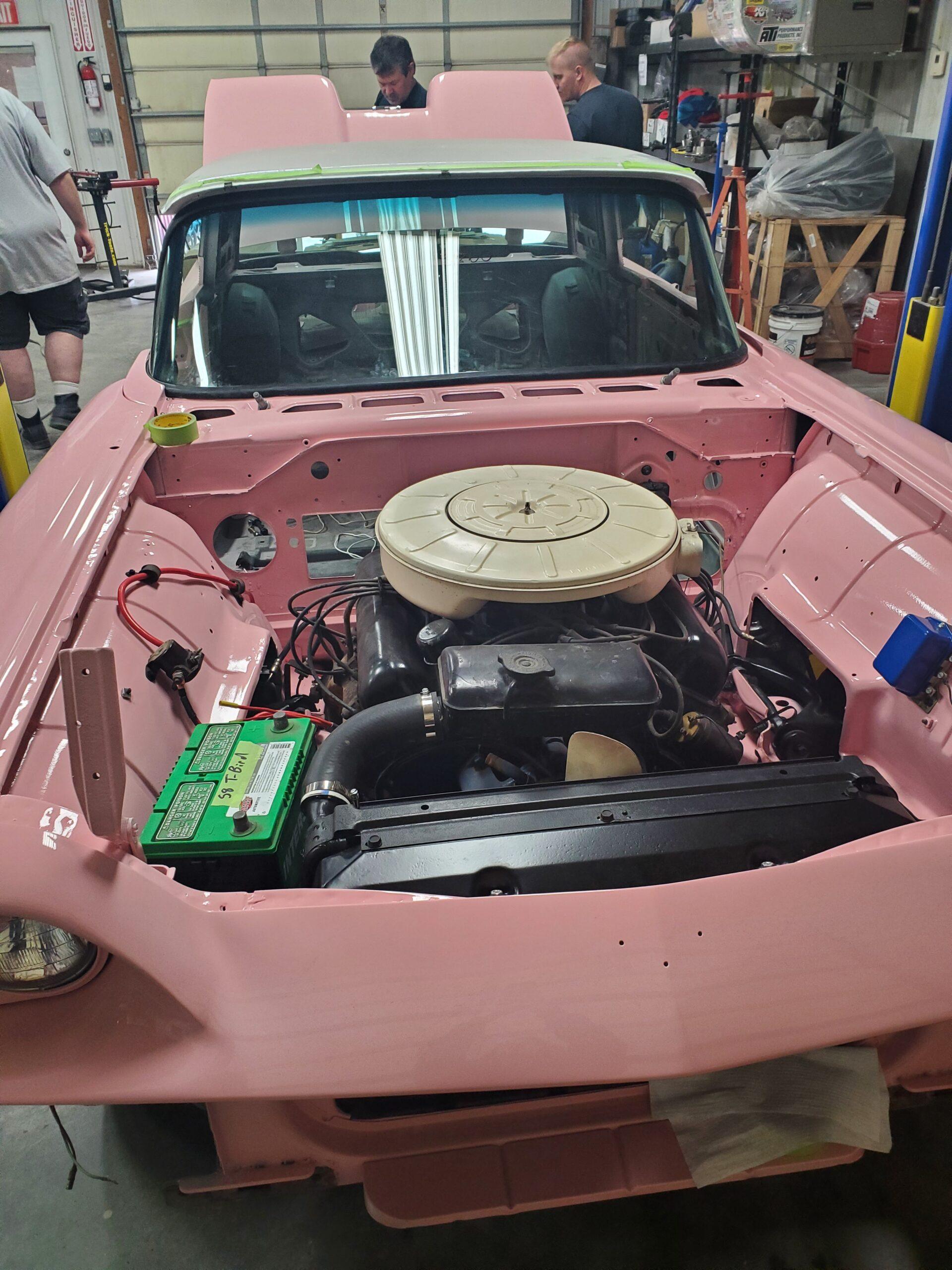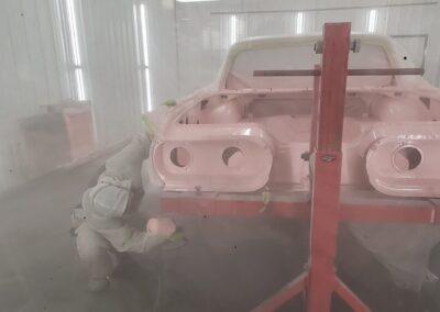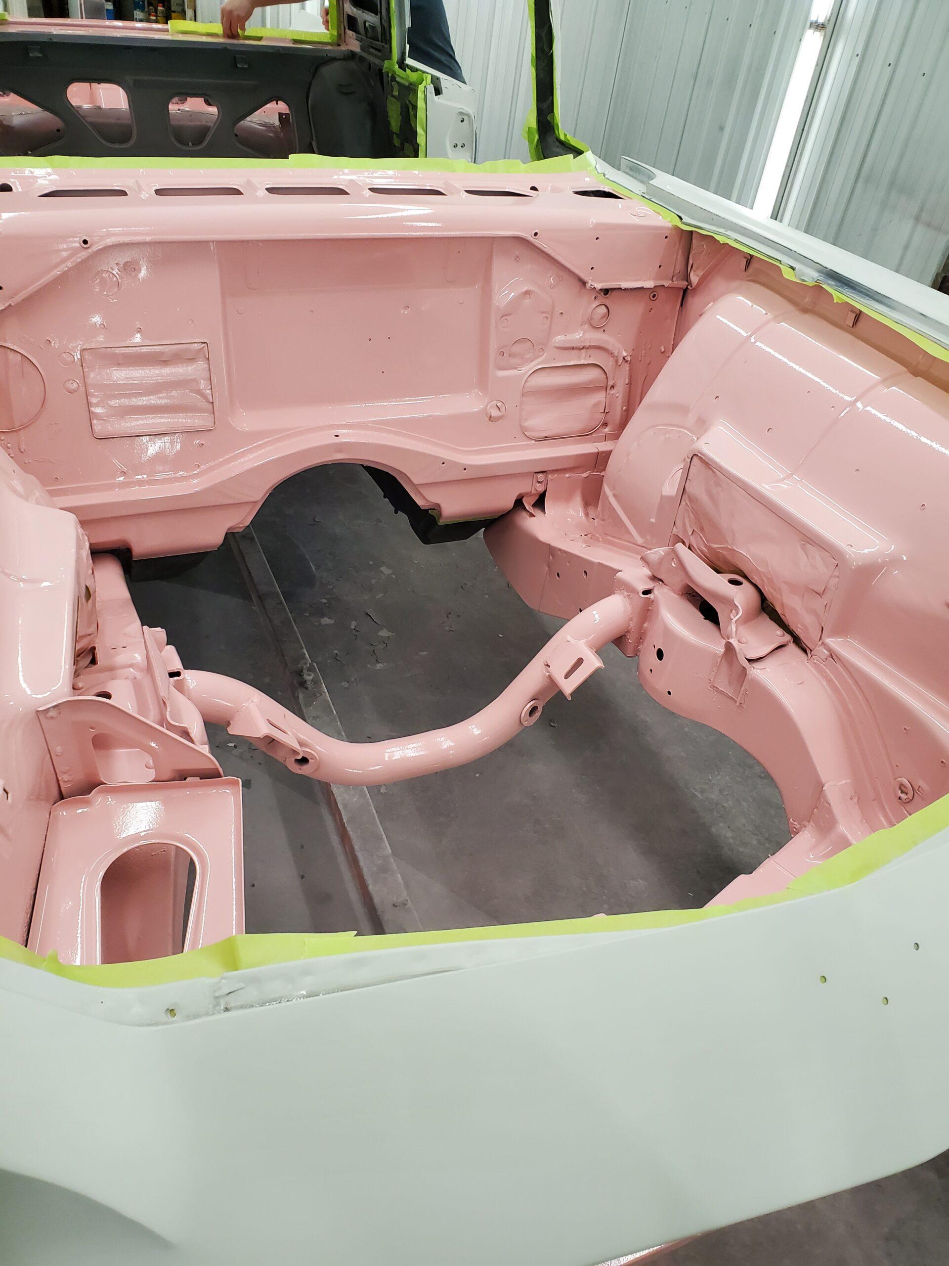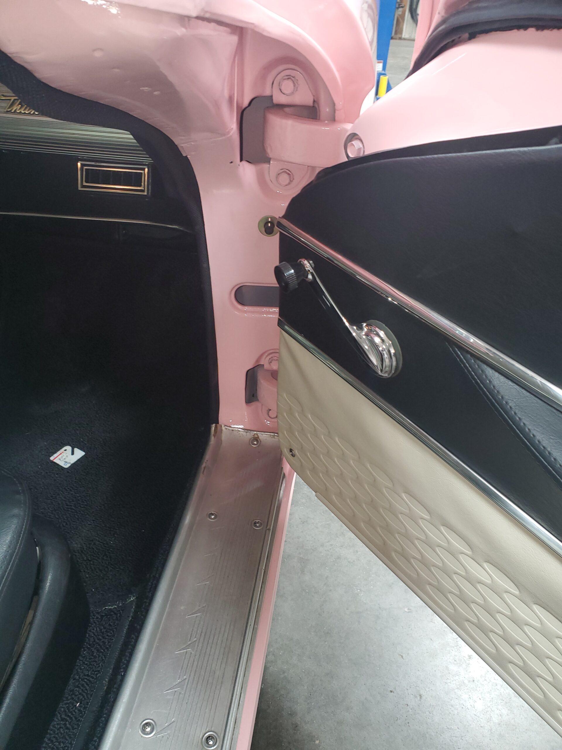 For the next 11 months, the car was completely disassembled, sorted, cataloged, mounted to the rotisserie, and then media blasted. That’s when the Fabrication Department took over. Because not all of the replacement sheet metal panels were available, many of the repair areas were handcrafted in-house here at Dig’s. After the metal work was complete it continued to the Body and Paint department where it received its original paint color combination: Cameo Rose and White, with a subtle, custom touch of White Pearl, with a hand-painted Betty Boop to give it that unique effect. Once all components were painted, it was moved to the Reassembly area, where all the pieces were inspected, cleaned, and polished. This car received a new reproduction interior kit, wiring harness, glass, weather stripping, aftermarket Vintage Air A/C system, full exhaust, new tires, rechromed bumpers, among many other upgrades.